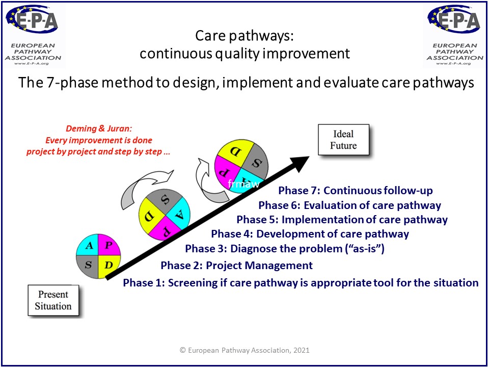 The 7-phase method was developed by an international team of researchers, clinicians and managers, to support multidisciplinary teams in the development, implementation, evaluation and continuous monitoring of care pathways. It can be used in different health care settings, within and across organizations.