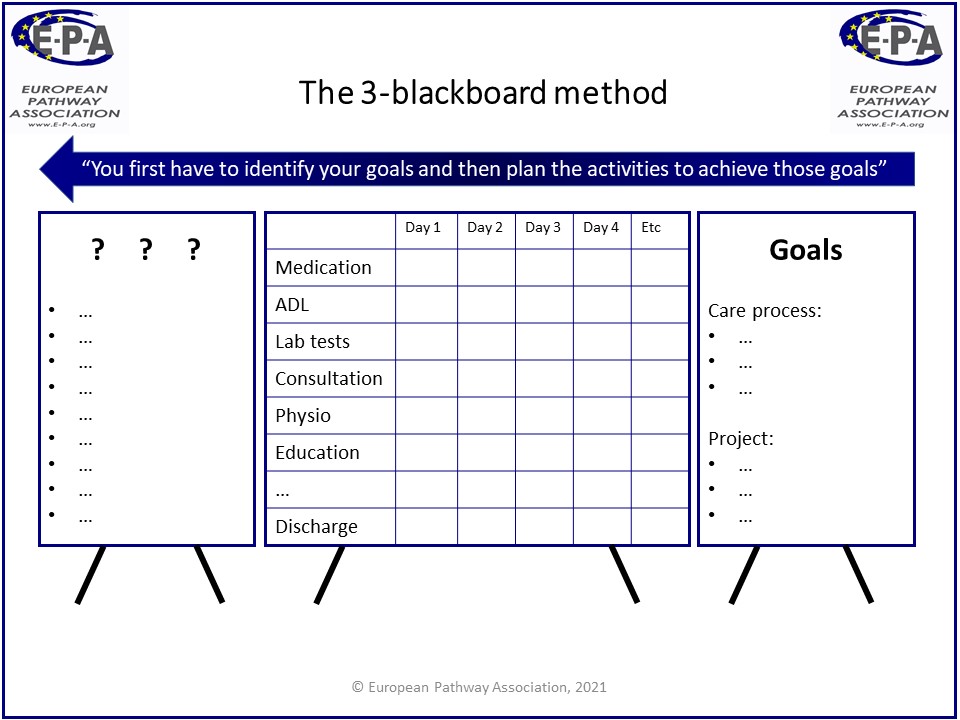 The 3-blackboard method is a consensus building technique for explicating the clinical content of a care pathway. The method was first developed at the Center for Case Management (CCM) in Boston (www.cfcm.com). The method was further elaborated within the Belgian Dutch Clinical Pathway Network and E-P-A master classes, and is used in the ‘screening phase’ of the 7-phase model. The method is based on the slogan: “you first have to identify your goals, and then plan the activities to achieve those goals!”